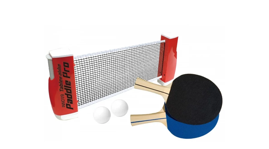 Set loparjev za namizni tenis za začetnike, ki vključuje 2 loparja z zrnato površino, 2 žogici za pingpong in univerzalno izvlečno mrežo, ki jo je mogoče enostavno namestiti na vsako mizo do širine 176 cm in debeline 4,2 cm. Zahvaljujoč gumiranim pritrdilnim ploščam zagotavlja stabilno pritrditev, ne da bi pri tem poškodovali mizno ploščo. Priporočljivo za uporabo v zaprtih prostorih.